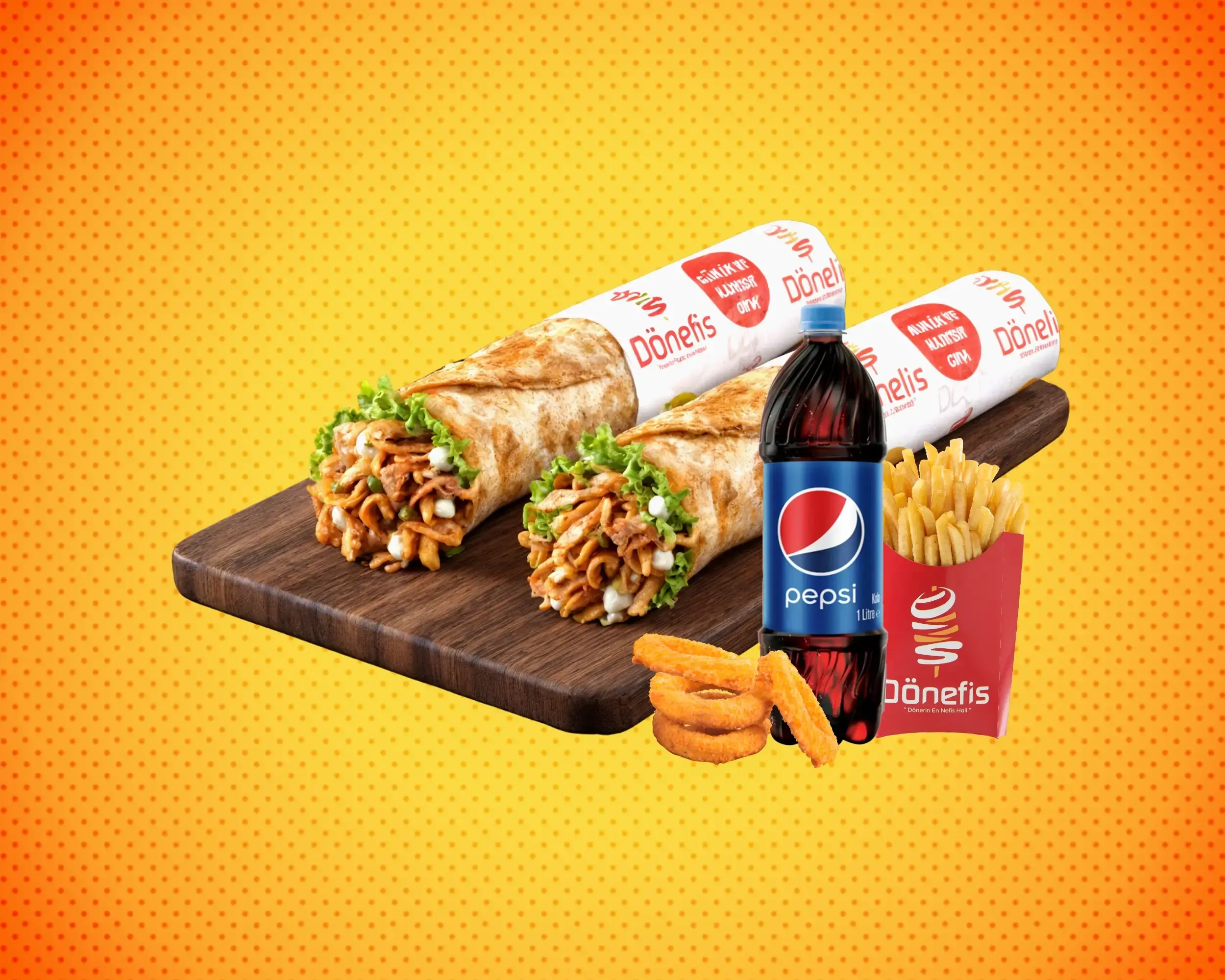 2 Standart Dürüm + Büyük Boy Patates Kızartması + 4 Adet Soğan Halkası + Pepsi (1 L.)
